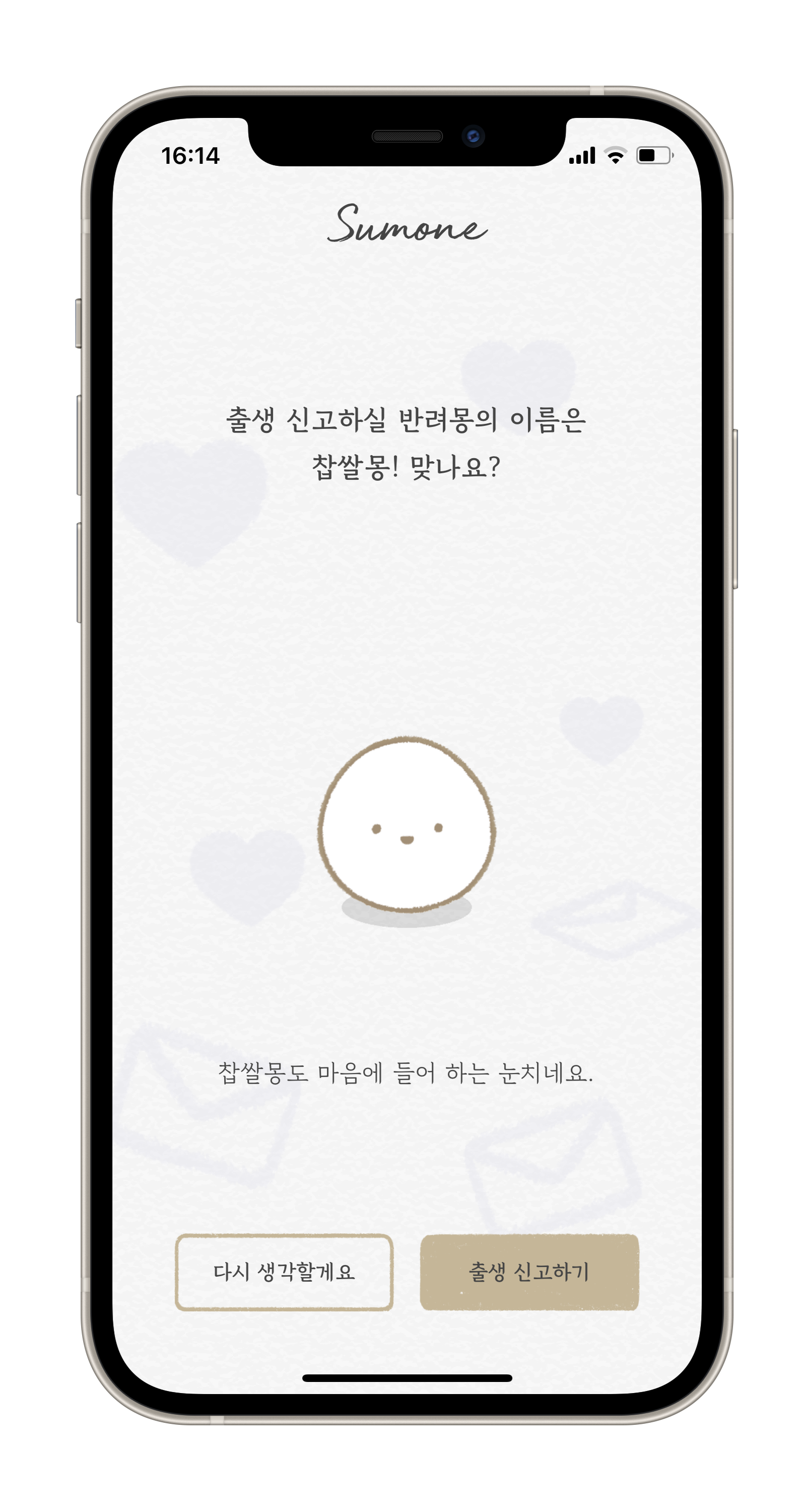 이름을 적고 출생 신고하기를 누르면 반려몽 출생 신고가 완료돼요! 사랑으로 잘 돌봐주시길 바래요